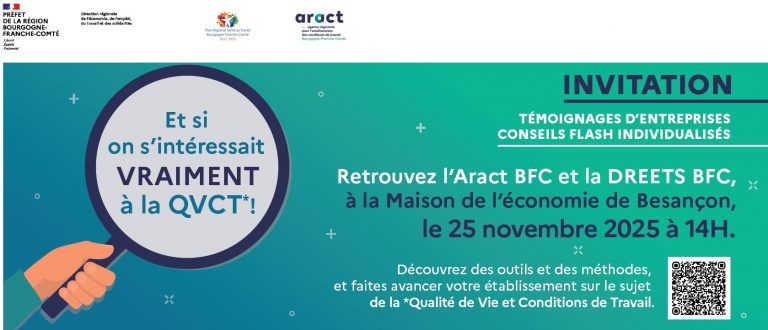 L’Aract BFC et la DREETS BFC vous proposent cet événement dans le cadre du plan Régional Santé au Travail (PRST 4). Venez consacrer un après-midi à découvrir ce qu’il y a concrètement derrière les termes « Qualité de Vie et Conditions de Travail » (QVCT).